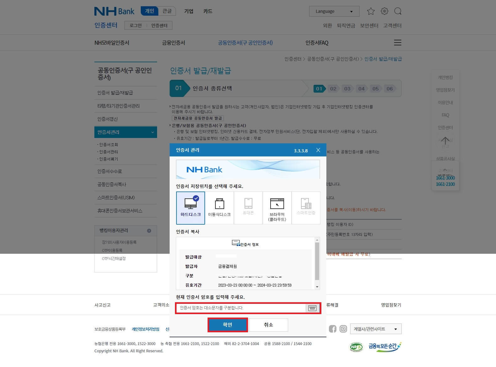 인증서 비밀번호 작성 후 확인 – 복사 완료