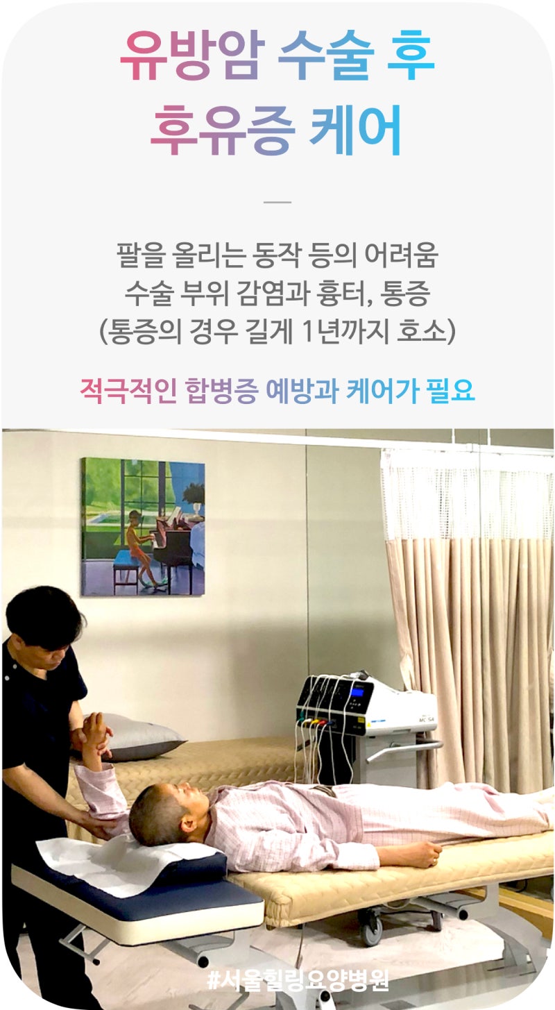 하지만 유방암 항암치료는 수술 후 미세잔존암세포를 제거하기 위해 이뤄지는 것으로 향후 암세포의 재발, 증식, 전이현상 등을 억제하는 데 도움이 됩니다. 하지만 한편으로는 후유증으로 인한 어려움이 있으신 분들은 유방암 요양병원에 방문하셔서 항암 면역요법을 받아보시기 바랍니다.